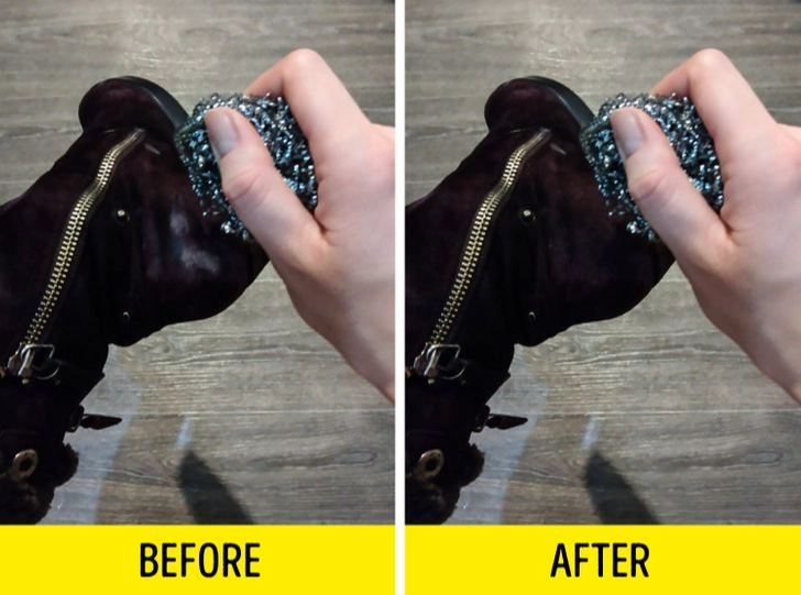 If shoes get wet, press a dish sponge gently onto damp areas to absorb moisture. Avoid rubbing to protect the delicate suede.