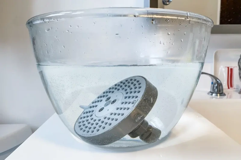 Fill a plastic bag with vinegar and secure it over the shower head. Soak overnight, remove, run water, and mineral buildup washes away.