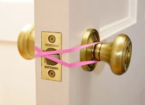 Loop a rubber band over both knobs crossing the latch tongue. The latch stays depressed so the door stays ajar as you pass through.