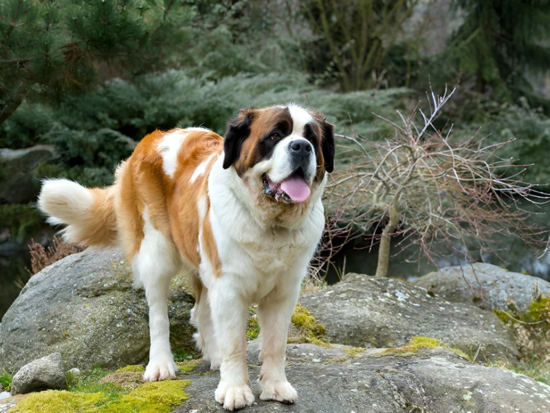 The St. Bernard is a massive, powerful working dog. It can weigh up to 260 pounds and stand 35 inches at the shoulder. Bred for rescue, St. Bernards were developed by the hospice at the St. Bernard Pass to aid travelers stranded in Alpine snow.