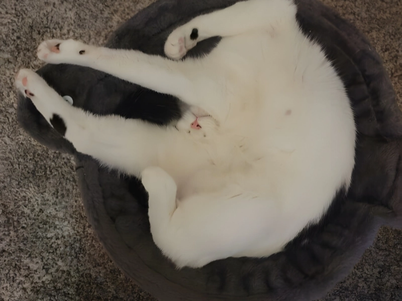 Cats can morph into the oddest shapes, especially in sleep. This cat has twisted into such a contorted pose that it is hard to tell where the head ends and the tail begins.