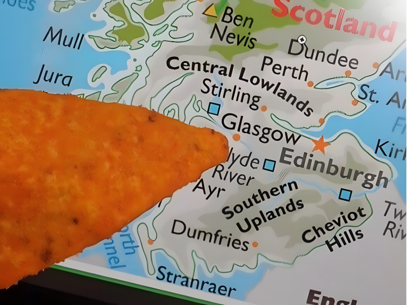 ドリトスとグラスゴーの間には特別なつながりがあるのかもしれないが、私たちの注目を引くのは、チップがポインターとしていかにうまく機能したかということだけだ。指はそういう用途に使われるのが普通だが、このおいしい一口は指と同じくらい、いや、それ以上においしかった。特にグラスゴーは地図上で非常に小さく目立たないように見えることを考えると、彼はできる限りのヒントを得たと私たちは考えている。