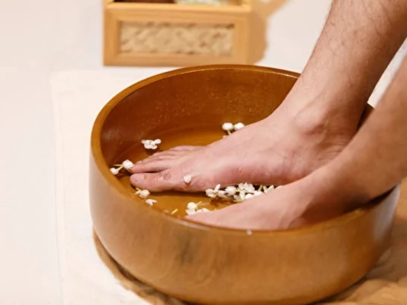 エッセンシャル オイルを数滴加えると、足湯の香りが良くなります。ペパーミント オイルは涼しさと元気を与える効果がありますが、リラックス効果のあるラベンダー オイルは最適です。肌の敏感さを防ぐには、最高級の純粋なエッセンシャル オイルを選び、量を 3 ~ 5 滴に制限してください。