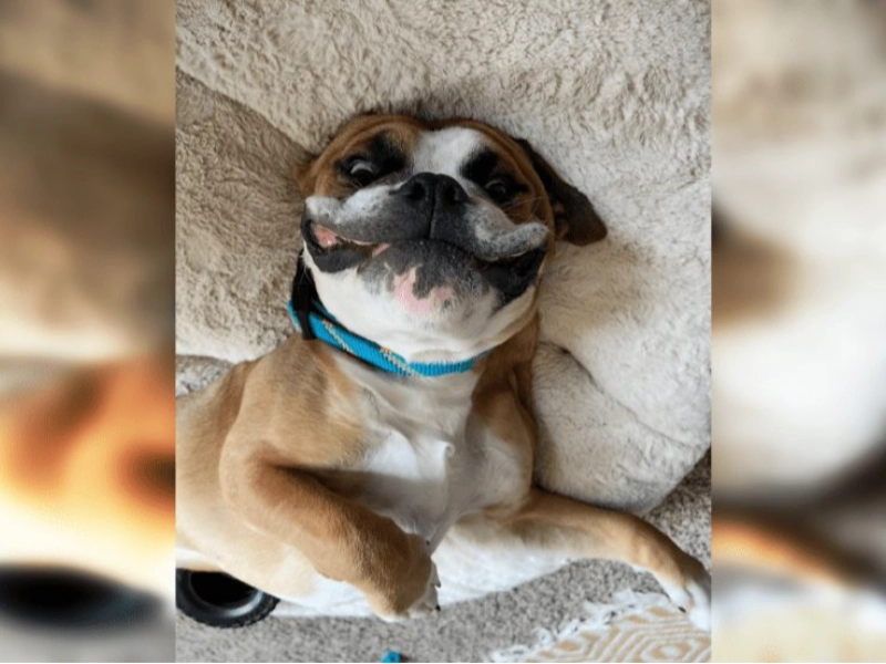 This puppy's grin results from photographer's perfect timing. With happy face and wagging tail, this little dog radiates pure joy. Such moments remind us why dogs earn the title of man's best friend—they never fail to generate smiles.