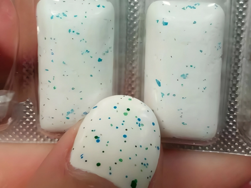 Opening a pack revealed speckled gum identical in pattern to her white polish flecked blue and green.