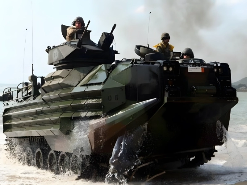 AAVP-7A1 Amphibious Assault Vehicle (Amtrac) Source: Facebook.com / Alfonso Meo The AAVP-7A1 offers a 300-mile land range and a 20-mile water range, ideal for amphibious operations. It can handle conditions up to Sea State 5, proving its toughness in rough water. Built by United Defense, it mounts an M2HB .50 caliber machine gun for strong assault support. Its blend of mobility, protection, and firepower makes it essential for transport and support on land and sea.