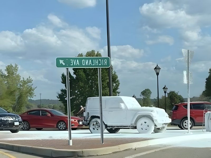 A car sits hopelessly immobilized in an active construction zone, serving as the perfect example of terrible timing. Fresh concrete has been poured surrounding the vehicle, which now appears fossilized in the hardening material. Construction workers gather around, scratching their heads about how to address the situation. The concrete is already setting around the tires, turning the car into an unintentional art installation. Yellow caution tape flutters nearby, drawing additional attention to the scene. This situation stands as a vivid reminder to always observe construction signage, as ignoring warnings can lead to expensive errors—potentially one of the costliest parking mistakes in recent memory.